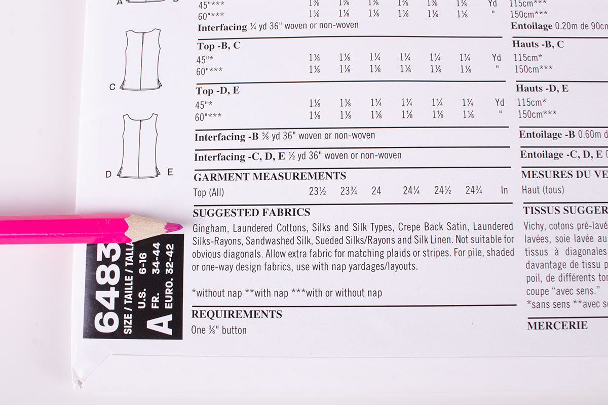 What the information on the front and back of the pattern envelope means.